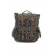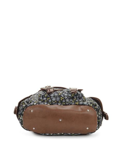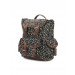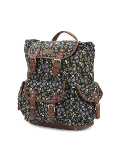 Black floral printed backpack with branding and a flap on the front that has mock buckles and magnetic closure