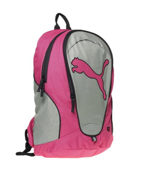 Pink and grey backpack that has one main two way zipped compartment with an inner patch pocket