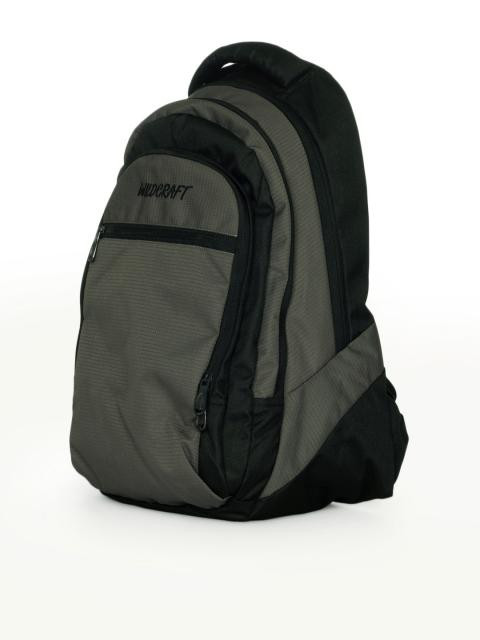 Black and grey backpackTwo padded and adjustable shoulder straps, one padded haul loopOne main zip compartment