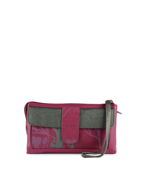 Pink purse with mobile pouch on the front with bronze coloured flap and magnetic button closure
