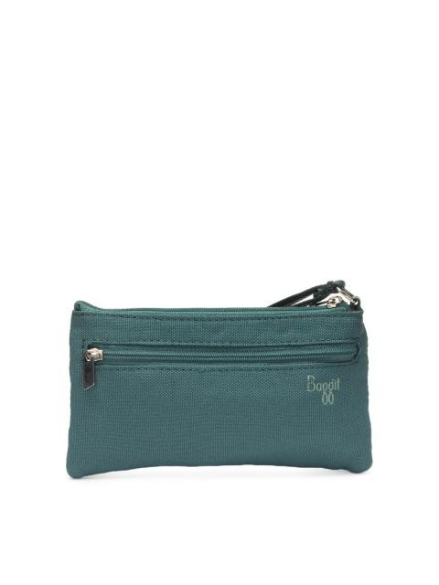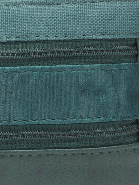 Teal purse crafted from synthetic material with a shining fabric overlay on the front