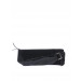 A black wallet with a sheen and a brass colour buckle and synthetic tie up detail on the side