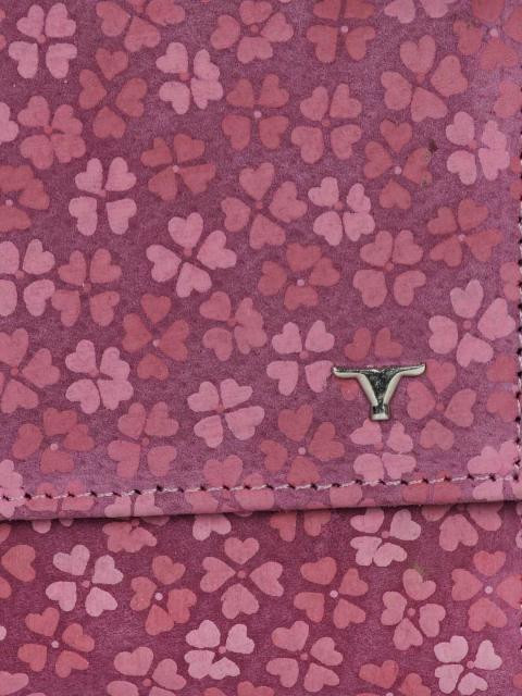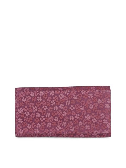 Purple floral designed two-fold wallet with a flap fastened by a press button closure