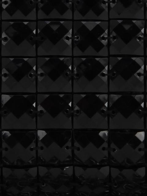 Black clutch, embellished with square shaped beads that have a faceted surface, has a press clasp