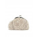 Beige clutch with lace ruffles all over, a kisslock clasp for closure, two detachable silver chains – one long and one short for carrying ease, one main slot with a card slot on the side