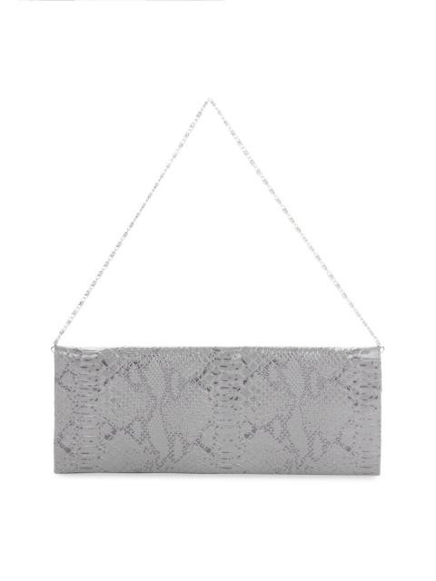 Grey textured clutch, double flaps with metal rim and magnetic closure, two detachable silver chains – one long and one short for carrying ease, two slots - each beneath a flap with a card slot in the first one