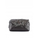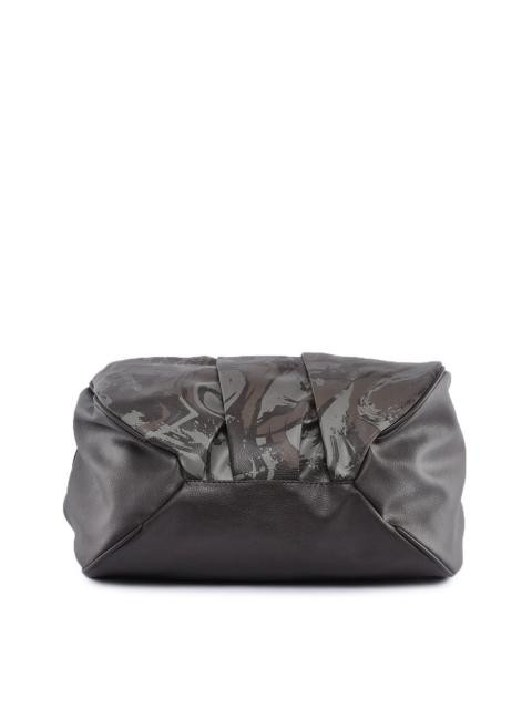 Made of synthetic leather for durability with a busy print on the front, with pleating