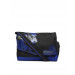 Black and blue printed messenger bag, has a flap across the mouth with dual Velcro closures