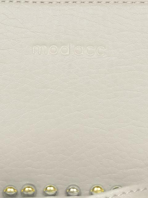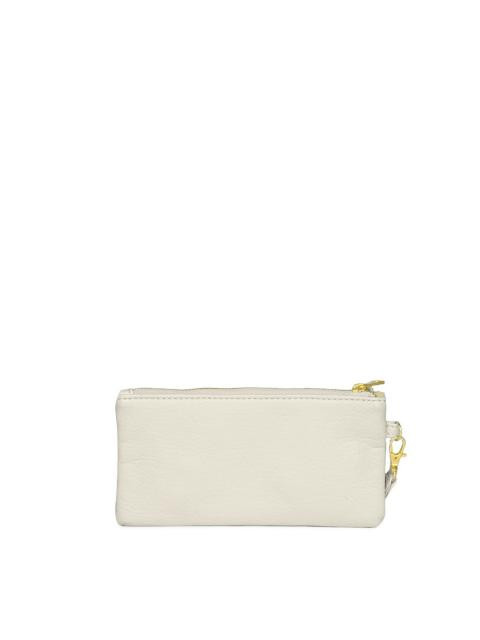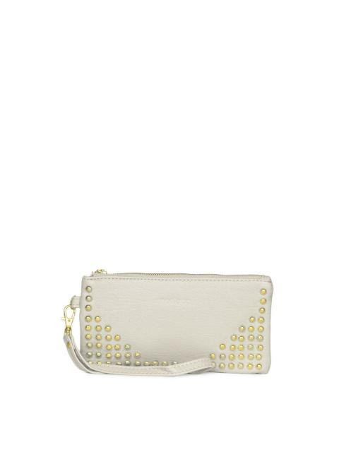 Light grey purse with golden rivet details and branding on the front, one main zipped pocket with a card slot inside, one short detachable strap for carrying ease