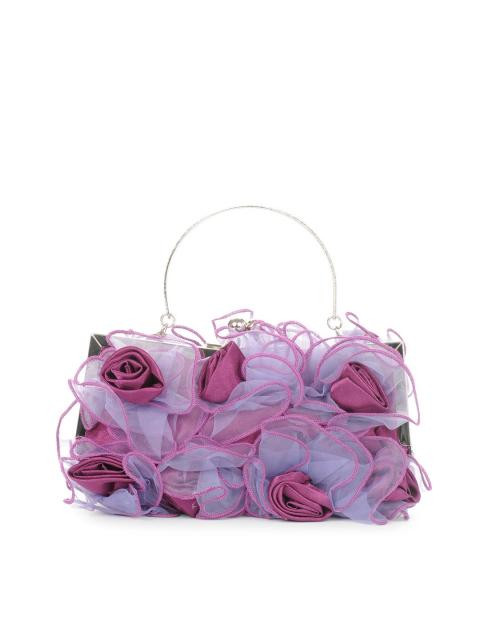 Purple clutch with rosette details all over in net and satin, a kisslock clasp for closure, one short metallic handle on the inside and one long detachable silver chain for carrying ease, one main slot with a card slot on the side