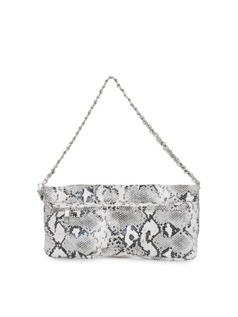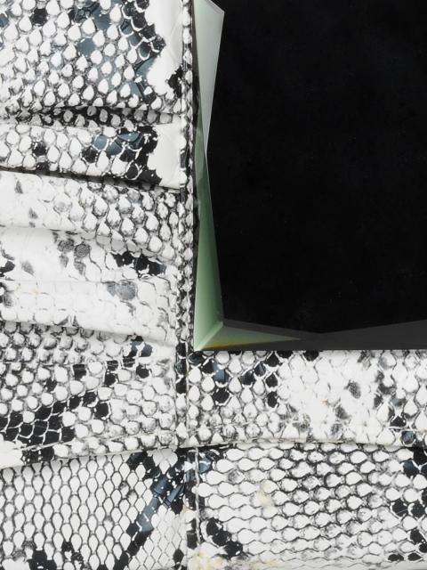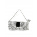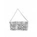 White and black textured clutch, a flap with a press buttoned closure, gathers on the front with a square black embellishment, two detachable straps – one long and one short for carrying ease, one main zipped pocket with a zipped pocket on one side and an organiser sleeve on the other side, one external double welted zipped pocket at the back