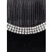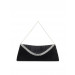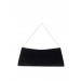 Black clutch that has a velvet feel and look with a crystal embellishment and pleated design on the front
