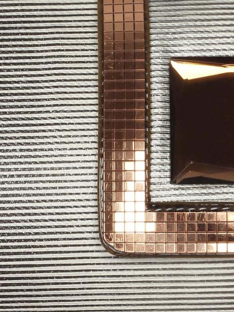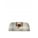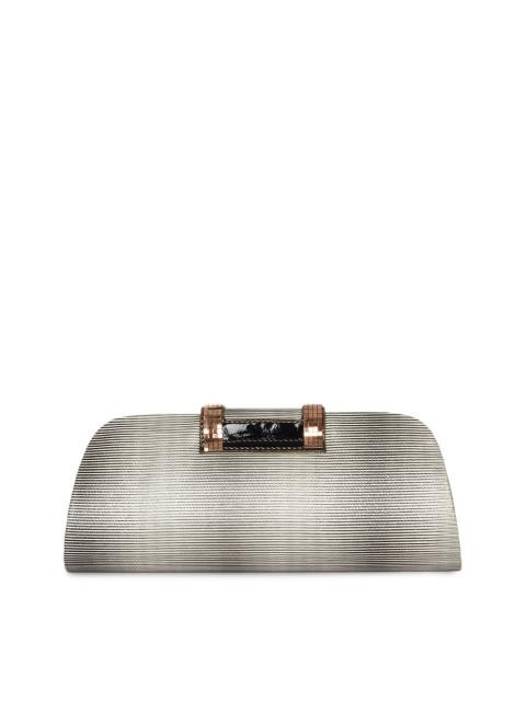 Stripe textured white and grey clutch with an embellished, buttoned flap