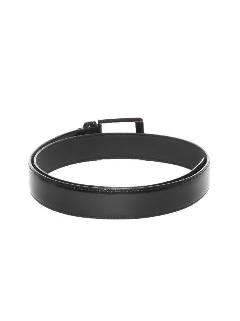 Black leather belt with a tang clasp, loop near the clasp, holes to customise Fit and branding on the tail