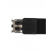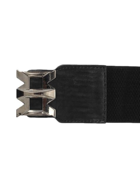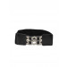 Wide, black belt that is elasticated with a leather patch that has a metallic design and hook clasp