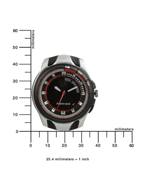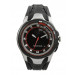 Dial style: Black textured dial, steel colour hands with white accents, branding near the 12 and 6 hour mark, white and red markings