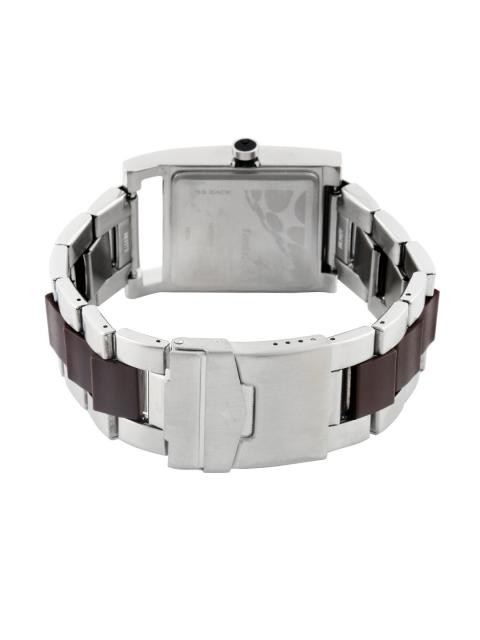 Strap style: Steel-toned and brown bracelet-style strap secured with a fold-over clasp