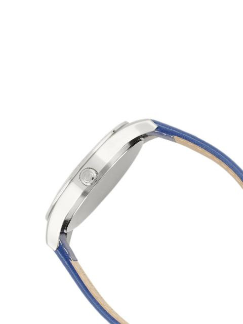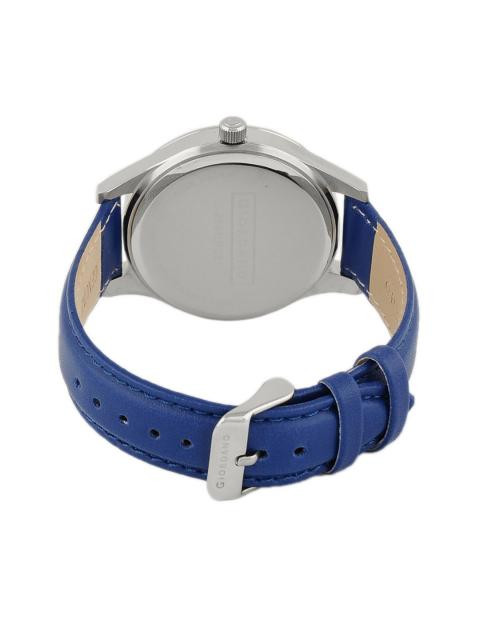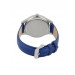 Strap Style: Blue, genuine textured leather strap with tang clasp closure, holes and loops to offer a snug fit