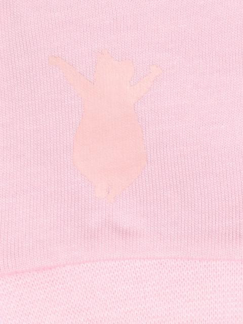Light pink mittens with mildly elasticated cuffs and print on the upper palm region