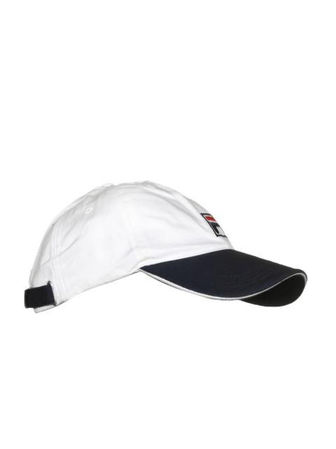 White upper with branding on the centre of the crown, has eyelets for ventilation, curved visor and an adjustable back strap