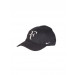 Navy blue cap made of 58% polyester and 42% cotton fabric with embroidered eyelets on the panels, velcro fastening at the back with embroidered name on the back and embroidered initials on the front