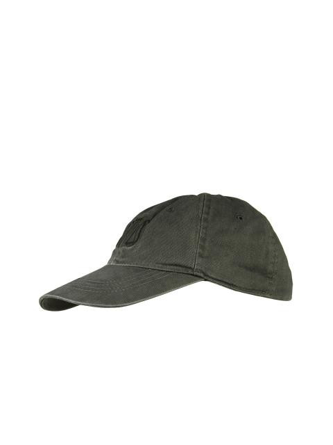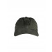 Black cap, has a curved visor, embroidered eyelets on the crown, an adjustable strap on the back