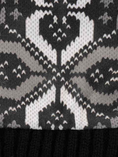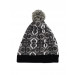 Black knitted cap made of 90% cotton and 10% acrylic, has grey print, a fluffy bobble on top, ribbed hemline and brand label on the hemline
