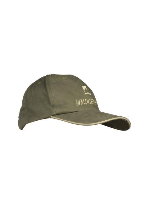 Olive green cap with embroidered detail, has a curved visor, a panelled crown with eyelets, a button on the centre, an adjustable buckle closure on the back