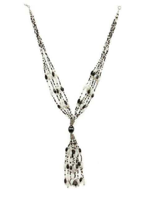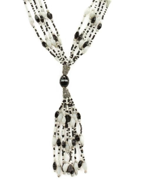 Five strand neck-piece with white and black beads, tassel detail in front, metal clasp