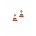 Has a red and white jhumka (a bell shaped dangler) with bead drops at the scalloped circumference of the dangler