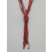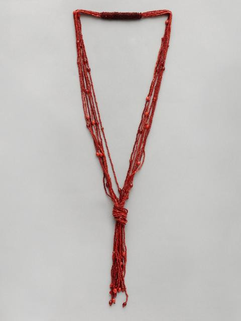 Red, beaded, multi-stranded necklace that is knotted at the end to give a pendant look and feel