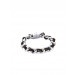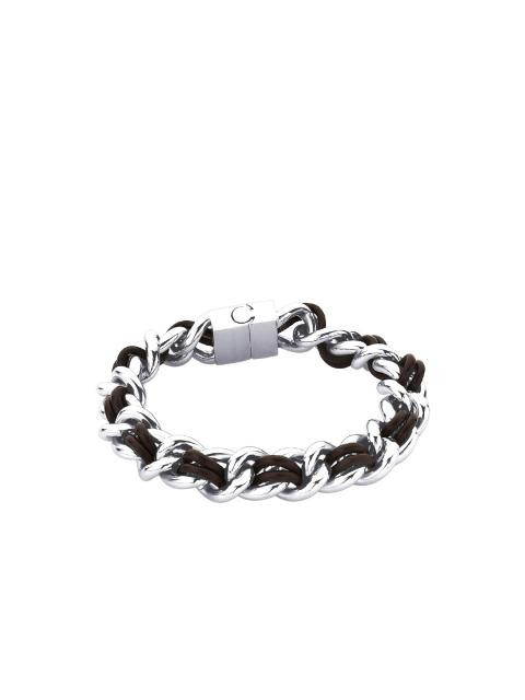 Silver coloured chained bracelet with leather strips intertwined through, metal magnetic clasp