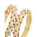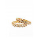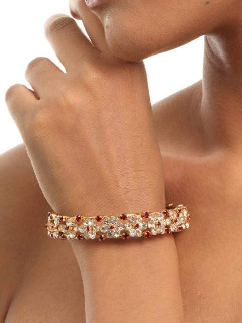 Golden coloured broad bangles, has two thin golden bangles linked together by white and red stone flowers to form one bangle and encrusted red stones at intervals around the periphery