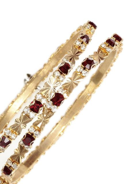 Golden coloured bangles, has maroon stone and white stone detail with intercepting golden floral design detail