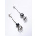 Silver earrings with a chain which has a grey coloured swarovski pearl drop with a cut-out spherical drop below it
