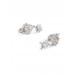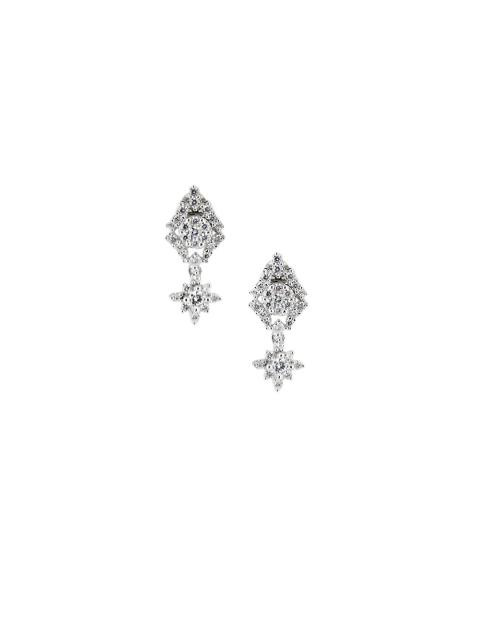 Silver earring with diamond shaped base and flower shaped dangler, has encrusted CZ diamonds