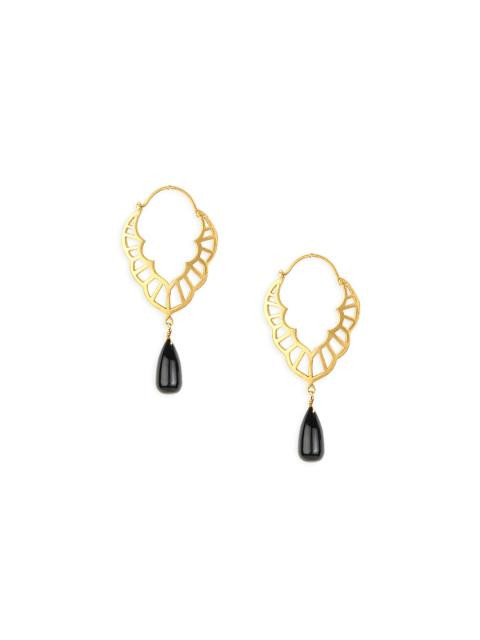 Oval shaped earrings with curves, lattice work, black onyx drops hanging from the edge, has a lever back closure