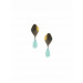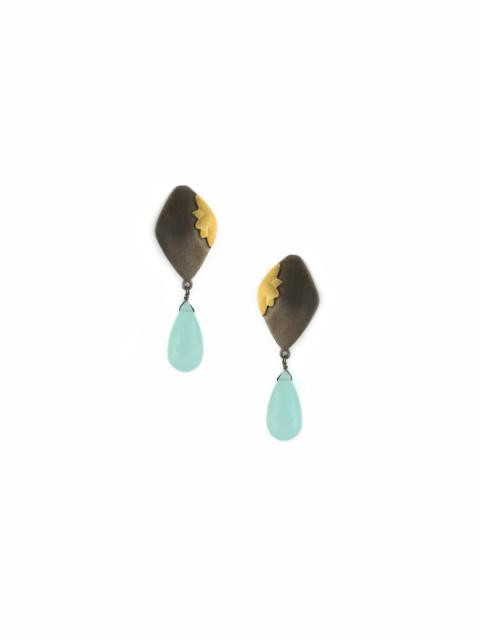 Diamond shaped earrings with floral pattern and sea green chalcedony drop below, has a push back closure