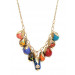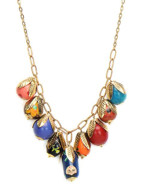 Golden coloured necklace with hand-painted, multicoloured beads at the centre