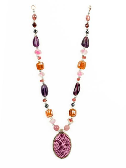 Chunky necklace with purple, rust and white glass beads, pendant with lavender bead details, metal clasp