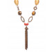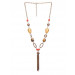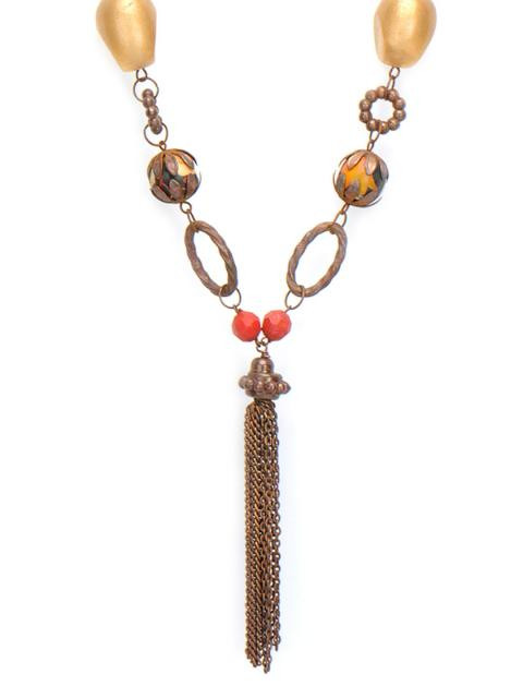 Bronze coloured necklace with multicoloured beads, chain tassel at the centre, lobster clasp