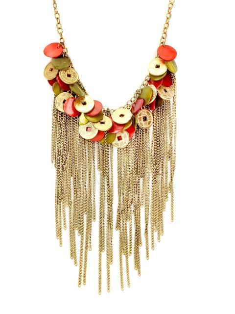Red and green discs, golden coloured coins and chains dangling at the centre