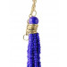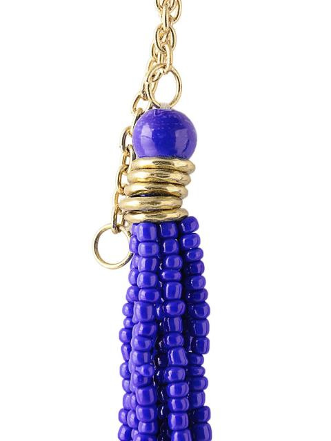 Eight strands of small blue beads culminating in gold ring and wide bead detail, which then links to a gold coloured chain