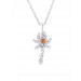 A silver flower shaped pendant with CZ diamonds and an orange stone in the centre