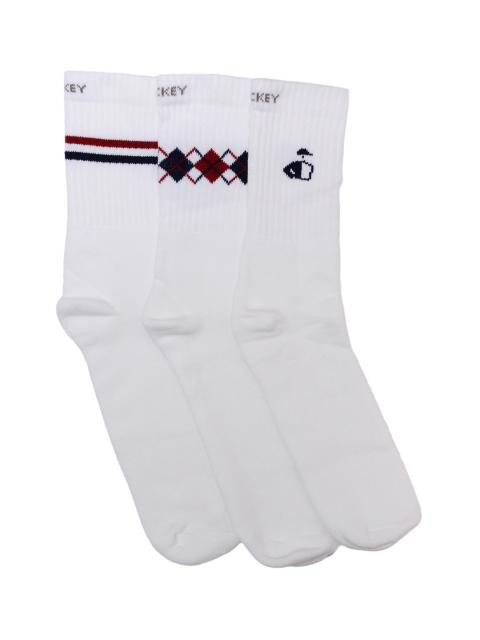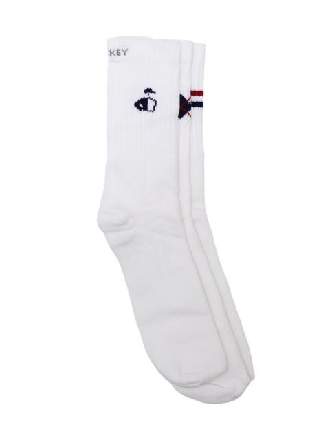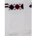 White socks with different coloured, knitted patterns, has an elastane welt for firm 'no sag' grip, terry lining inside for superior cushioning and absorbency, above ankle length and comfort toe socks
