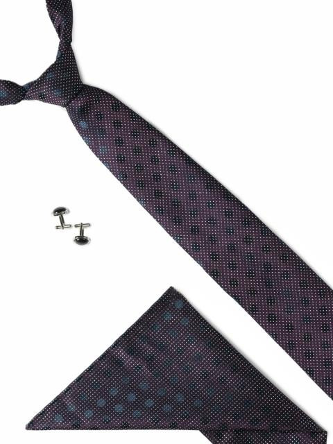 Specially woven on a Jacquard loom for vintage sophistication, this tie and pocket square set with cufflinks from Linos Perros is a great gift option or a delicious self-indulgence. The cosomopolitan man's formal wardrobe is not complete without colour options in ties, cufflinks and pocket kerchiefs.