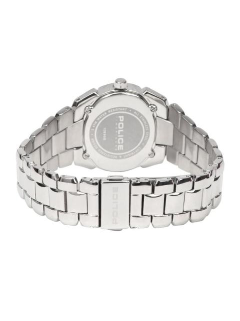 Case style: Analogue watch with a stylised rectangular case, has a fixed bezel and a stainless steel backDial style: Silver-toned dialFeatures: A screw to reset the time and a date apertureStrap style: Silver-toned bracelet-style strap, secured with a butterfly claspWater-resistant up to 30 metersComes in a signature Police caseWarranty: 2 years against manufacturing defects from the date of purchase