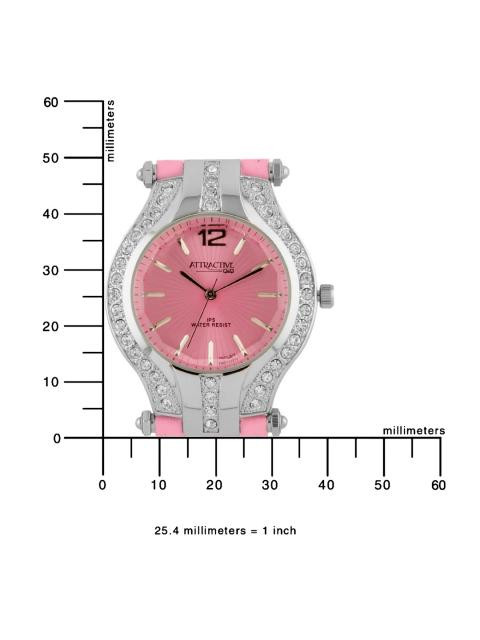 Case Style: Analog watch with a stainless steel back and round case, is studded with crystals around he dial