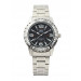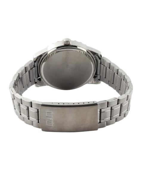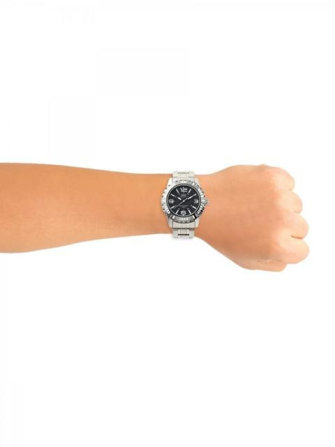 Case style: Analog watch with a circular case and a stainless steel back, a fixed bezel with minute markings