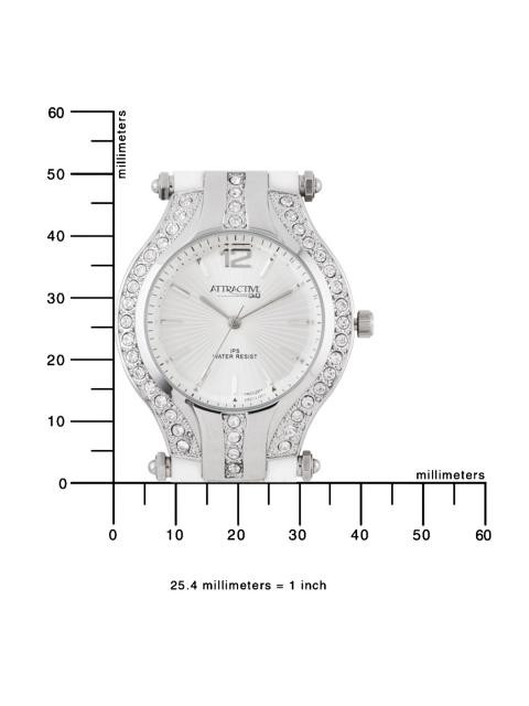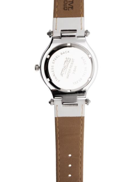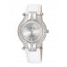 Case style: Analog watch with a steel round case with a fixed, stone encrusted bezel